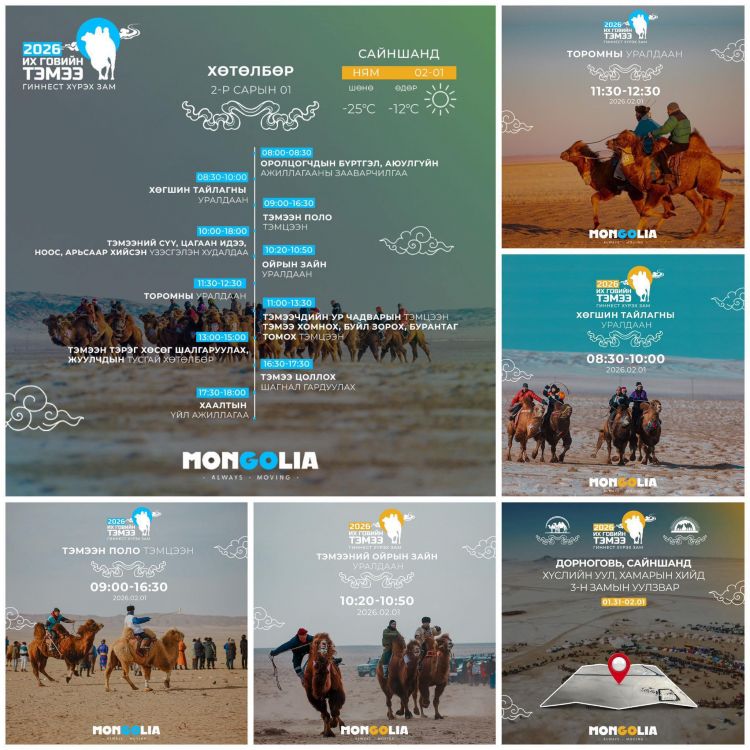 Дорноговь аймгийн ЗДТГ-аас “Их говийн тэмээ-2025” наадмыг нэгдүгээр сарын 31-нээс хоёрдугаар сарын 1-нд Сайншанд сумын нутаг, Хилэнцтэй хөшөөний орчимд зохион байгуулна.